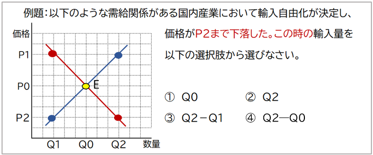 上のグラフの関係を順に読み取っていく問題になる。QやPと書いてあることで複雑に感じられるが、言っていることとしては「安い輸入品が入ってきて、商品全体も値下がりしたよ」ということ。問題にP2まで下落したと書いてあるため、P2の関係性に注目しよう。