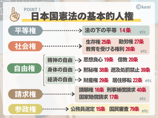以上の条文に関わる権利は、具体的な内容や判例まで登場する重要条文ばかりです。それぞれの単元で改めて紹介することになると思われますが、ここでも軽く抑えておいてください。