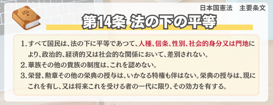 今回は「法の下の平等」について解説します。重要な判例が多いだけでなく、時事的な内容も含まれる単元になるので、それらを通して平等や差別について考えてみましょう。