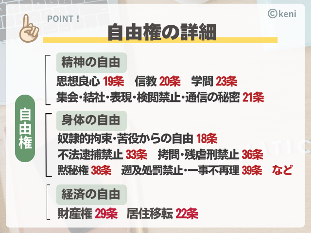 まずは自由権を細分化してまとめたものを見てみましょう。