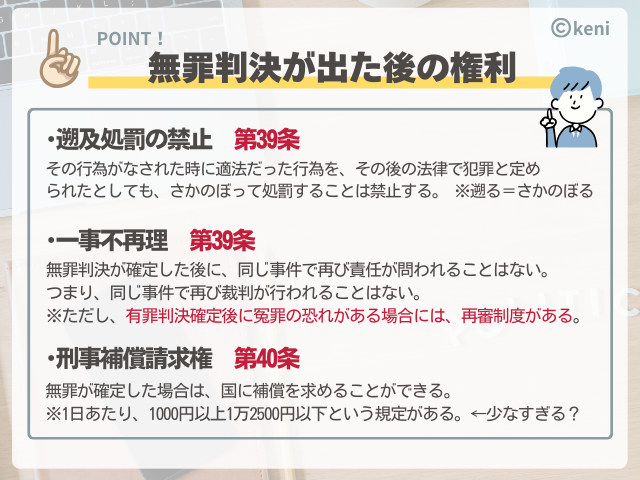 裁判で無罪となった場合、もしくはそれ以前の段階で釈放された場合、国としては罪のない人を不当に拘束したことになります。迅速に自由を回復させるための法律もありますし、裁判で無罪判決を受けた人を対象に、国からの賠償を行う制度もあります。