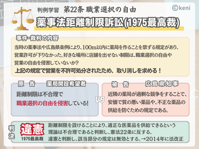 最終的に、「薬局が近い=不良品が出回る」という理論が、合理的とはいえないとして、違憲判決・規制無効となりましたが、職業の自由が一部認められた事例として覚えておきましょう。
